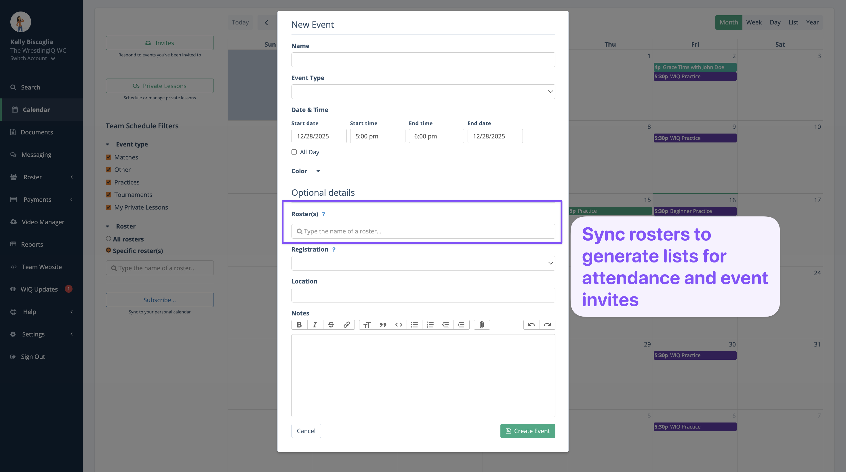 When creating, or updating, events on the calendar you can link specific rosters to each event.
