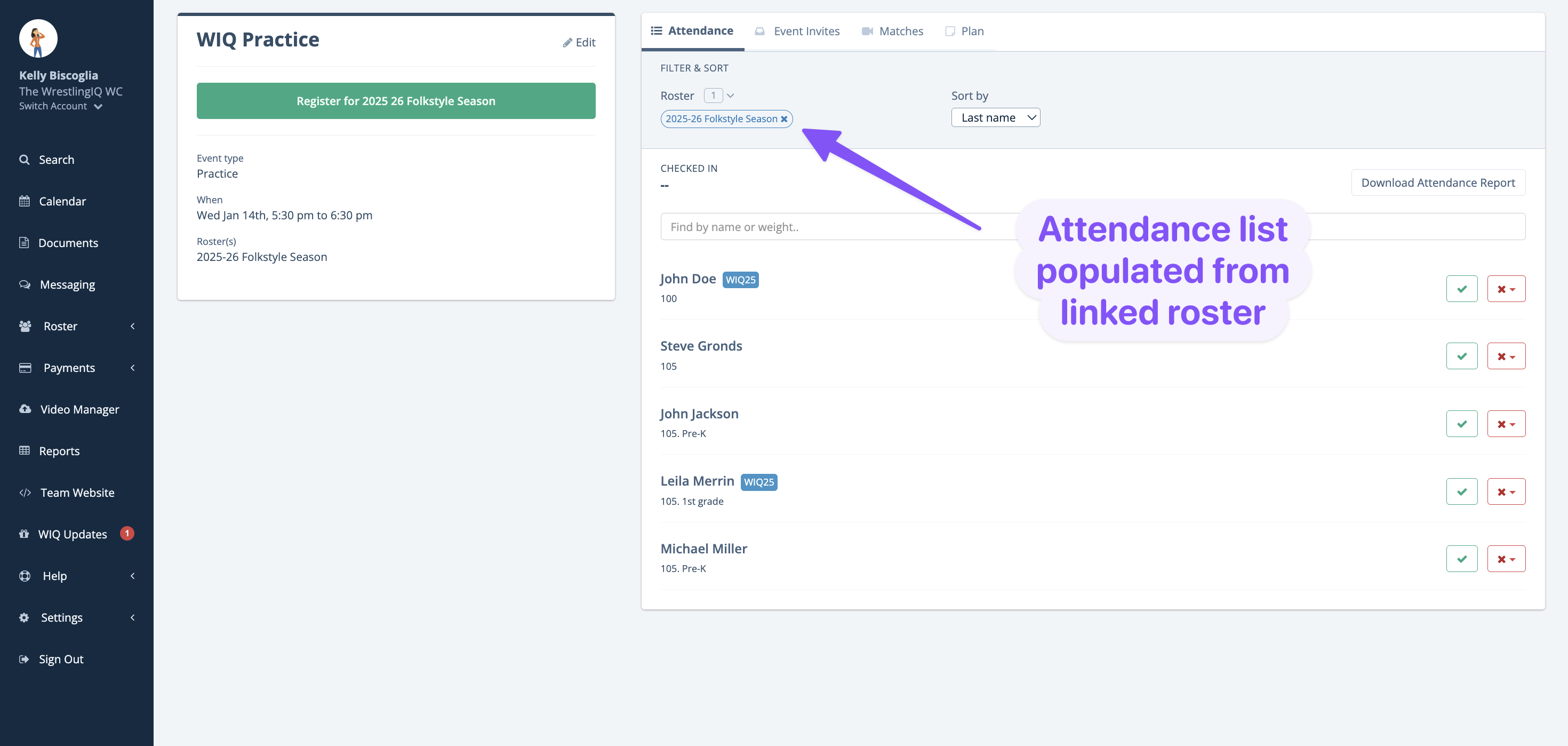 - Attendance: Linked rosters will populate the list of available athletes to check in using the WrestlingIQ Kiosk or generic roll call attendance.