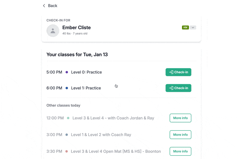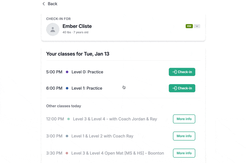 The parent/athlete will then select the class that they are checking in for. Classes the wrestler is eligible for show a "Check-in" button. Ineligible classes show why they can't check in.