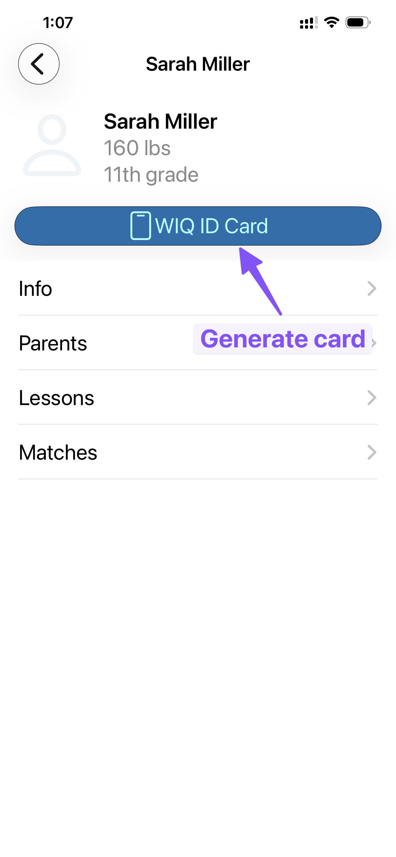 The easiest way for you to find your athletes WIQ ID card is through the mobile app. Navigate to 'My Wrestlers' and select the athlete profile. Under the profile you will see a button to access their WIQ ID card.