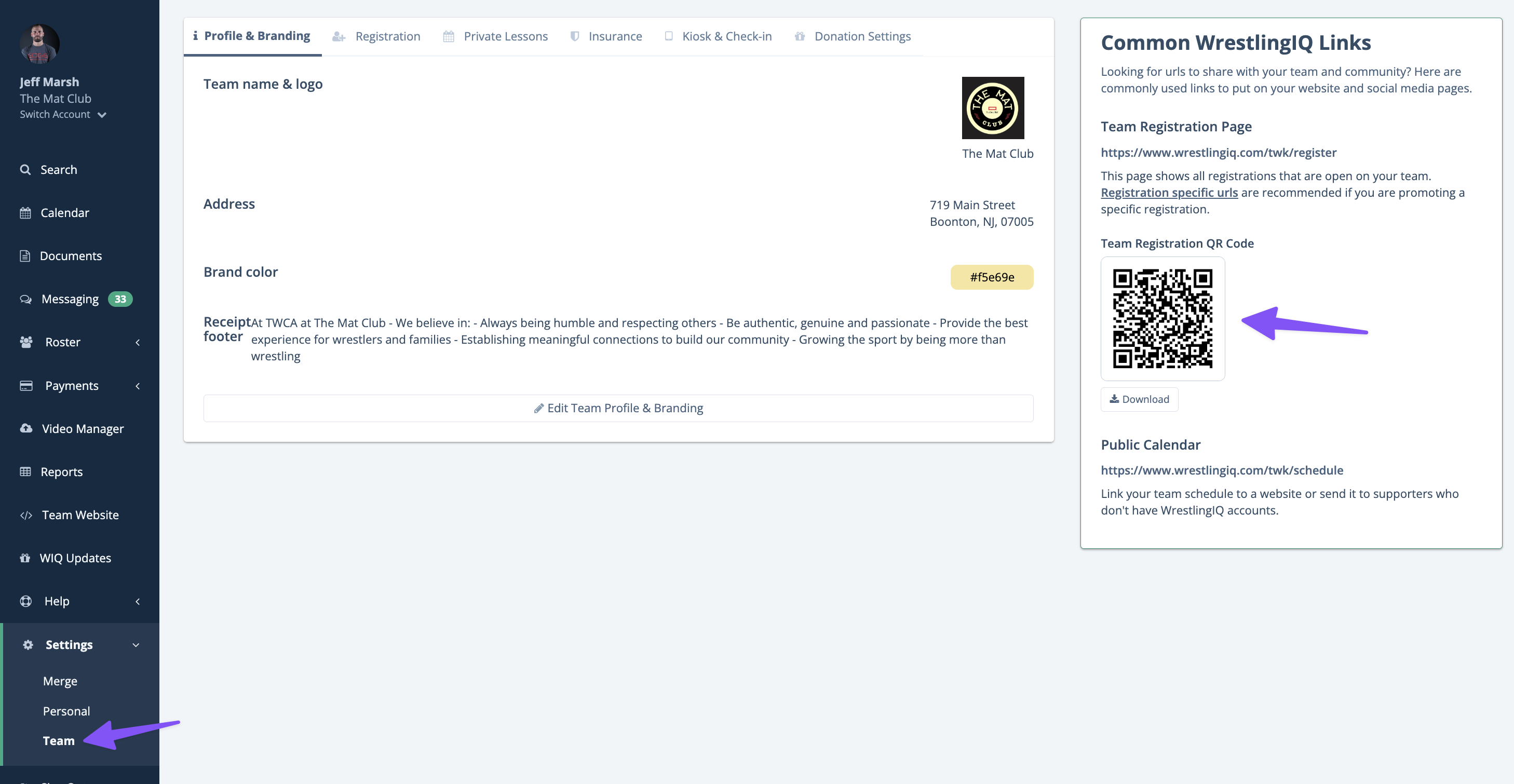 To find the pre-generated QR code for your team's registration page, navigate to your team settings. The QR code will be under your common links on the right hand side of the page.
