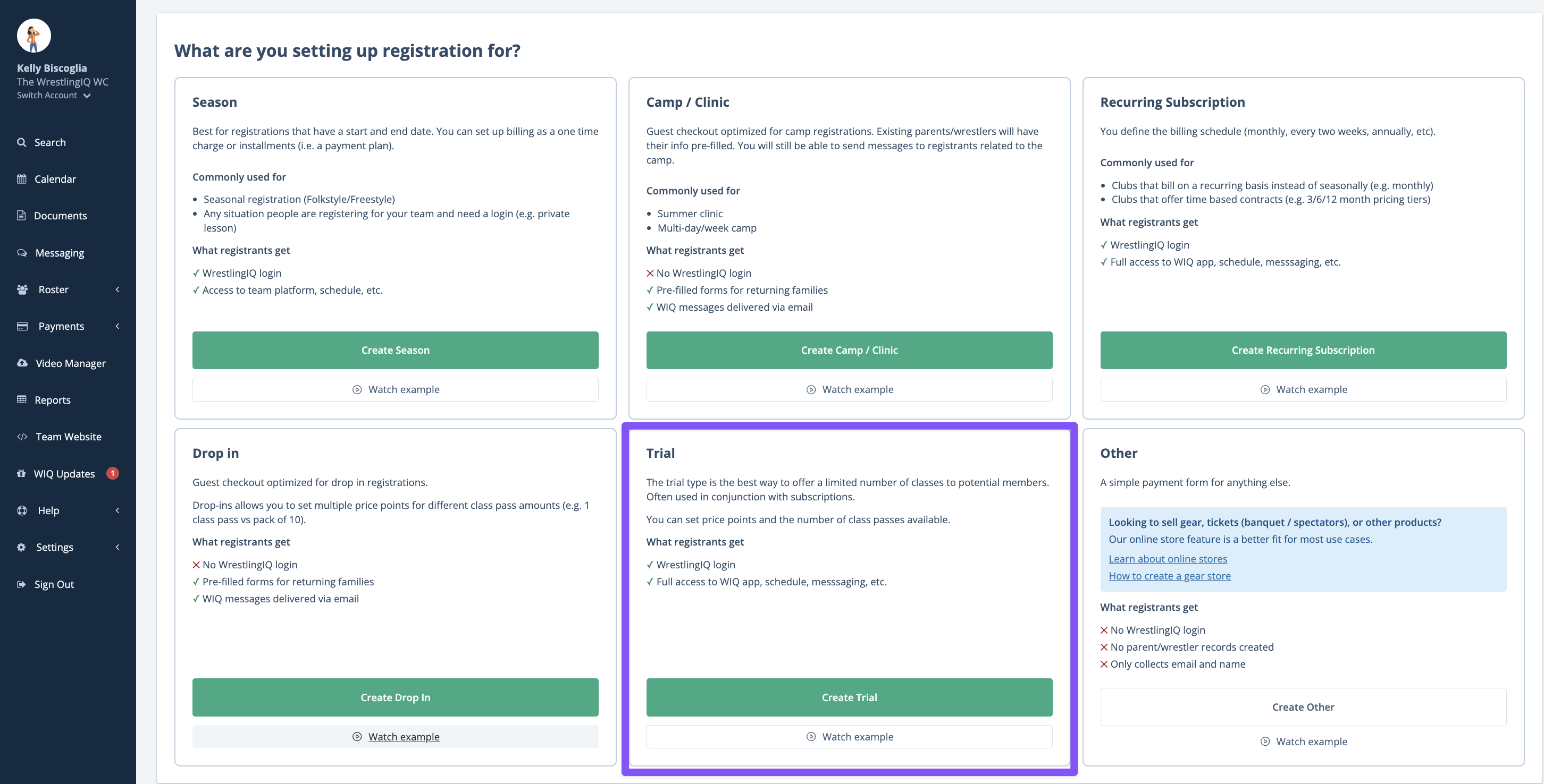 The Trial registration type is the best way to offer a limited number of classes to prospective members before they commit to a full membership. It’s commonly used alongside subscriptions to give families a low-risk way to experience your program.