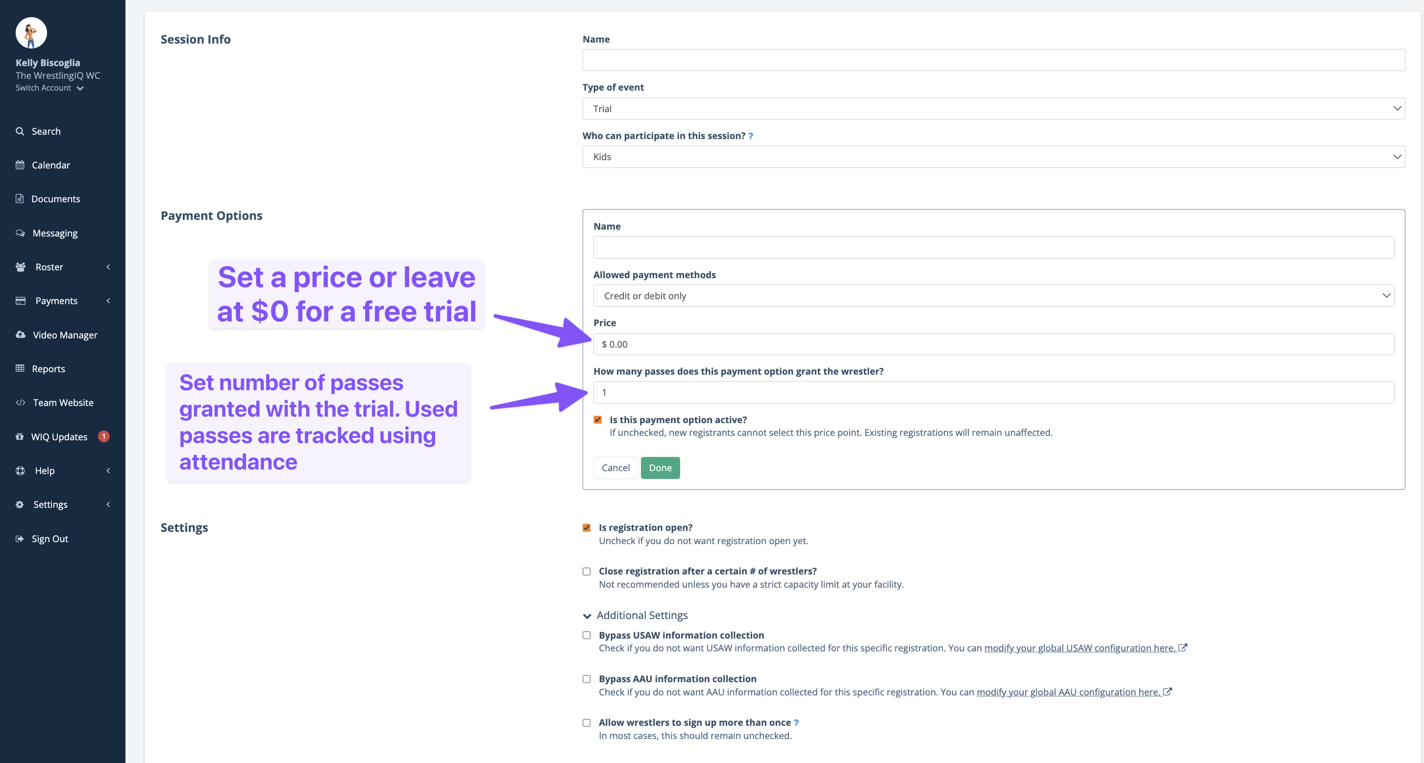 With Trial registrations, you can set a custom price (including free trials) and choose number of passes included in the trial.