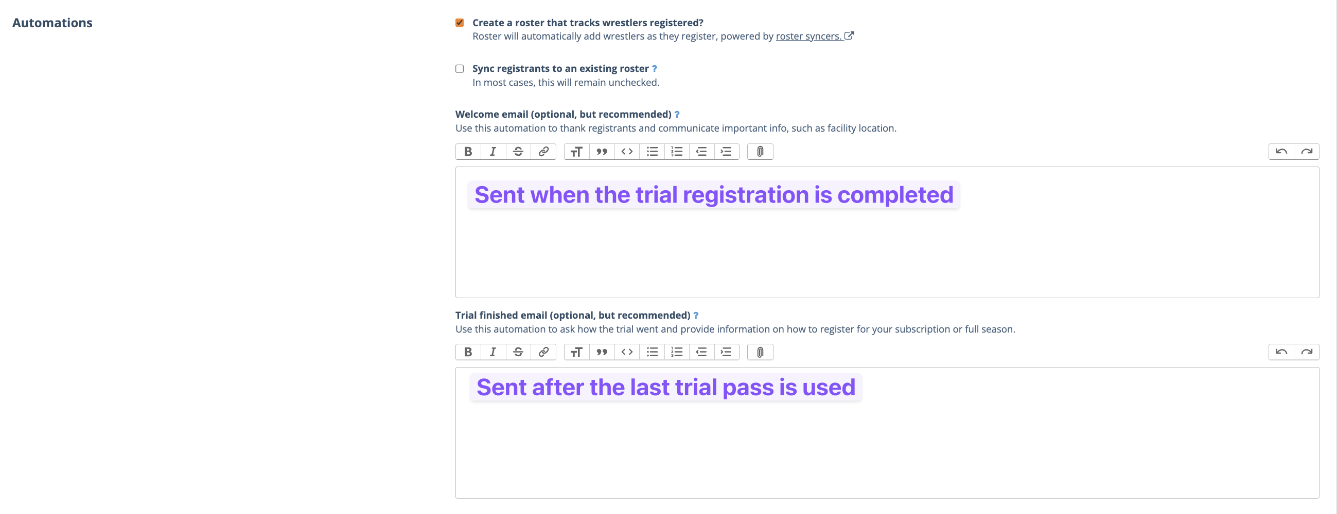 - The Trial finished email sends after the last trial pass is used (given that attendance is used to track practices). This is a great place to include your membership registration link and other membership info to those who just wrapped up a trial with your club.